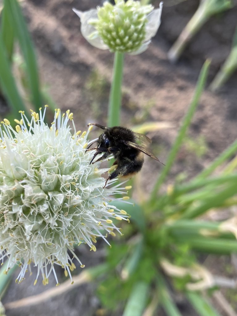 育ちすぎたネギの坊主にマルハナバチ(クロマルハナバチだろうか?)が来訪していた。